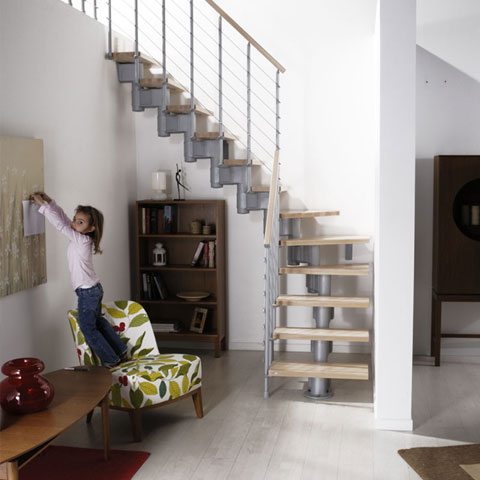 The treads and the handrail are in light (natural) or dark tinted solid beech. The metal parts are varnished black (RAL 9017), white (RAL 9010) or grey (RAL 9006). Finishes are black for the black staircase and grey for the grey or white staircases.